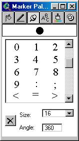 Ga dan naar marker palette en selecteer de "letter of cijfer in het toegevoegde lettertype" | Alle cijfers en letter zijn nu als marker in dit venster verschenen en dus te selecteren om stippen te zetten of weer te geven; in dit geval een ô. |