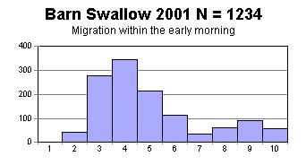 In autumn most birds migrate in the morning. 50% of birdnumbers (in autumn) migrate in the first 2.5 hours of the day. By using that part of the day for counting you can get a rather good idea of the migration that season. Not all species use the morning to migrate. The best example of daytime-migration are the larger raptors. But also Barn Swallow, House Martin, Swift, Skylark, Jay, Tits, Gulls, are typical birds of which the largest part of migration take place during the late morning and daytime.