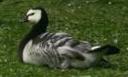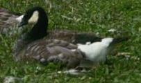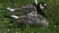 | In 1999 broedde in een stadsparkje te Castricum 9 paar Brandganzen (Branta leucopsis). Er huisde ook een paar Kleine Canadese Ganzen, de zogenaamde Hutchins Gans (Branta hutchinsii hutchinsii). Tussen de troep van enkele tientallen Brandganzen (broeders, niet broeders en jongen) bevonden zich twee vreemde vogels die mij deden denken aan hybrides. | ||
